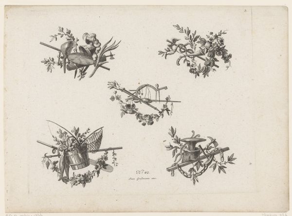 This print, called ‘Diverse trofeeën’ is an undated work, made by an anonymous artist. The print presents six distinct arrangements, each a careful composition of objects associated with various crafts and trades. Each grouping is not merely a collection, but a structured ensemble. Observe the repetition of elements like the laurel leaves, which serve not only as decorative motifs but also as structural devices binding the disparate objects together. This repetition creates a rhythm across the page, a visual echo that invites us to consider the underlying connections between these different professions. The trophies suggest not just skill but also a certain level of mastery and refinement, elevating the everyday into the realm of art. Consider how the artist uses line and form to create depth and texture, transforming utilitarian objects into symbols of human endeavor. The trophies invite us to reflect on how we assign value and meaning to objects.