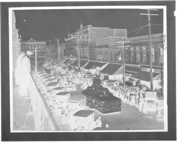 Editor: This gelatin silver print, "Untitled (tobacco warehouse seen from street, cars out front)" by Hamblin Studio, has such an eerie, almost ghostly quality due to its monochromatic palette. What strikes you most about its composition? Curator: I am intrigued by the interplay of light and shadow. The inverted tones create a visual paradox, where familiar forms become alien, challenging our perception of space and depth. Editor: So, the reversal enhances the formal qualities, drawing attention to shape and texture? Curator: Precisely. The negative presentation emphasizes the abstract patterns within the image, shifting our focus from the subject matter to the photographic medium itself. We see the world through the lens of its own representation. Editor: That's fascinating! I hadn't considered how much the process itself shapes our understanding. Curator: Indeed. The print's materiality and the artist's choices invite a deeper contemplation of photographic language.