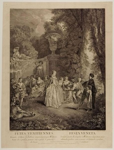 Laurent Cars created this print, "Galant gezelschap in een tuin", sometime in the 18th century. It presents a garden scene filled with figures, rendered with meticulous detail through the medium of engraving. The composition is structured around a central female figure, drawing the eye amidst a gathering of courtiers. Note how Cars uses the play of light and shadow to define forms and textures, from the soft folds of clothing to the dense foliage, creating a sense of depth. This is more than just a depiction of leisure; it's a study in social dynamics and visual hierarchies. The artist uses the semiotic system of dress and posture to communicate status and interaction, inviting us to decode the unspoken narratives within the scene. The print destabilizes the boundaries between formal portraiture and genre scene, challenging us to consider how representation shapes our understanding of social life. Notice how Cars merges aesthetics with cultural critique.