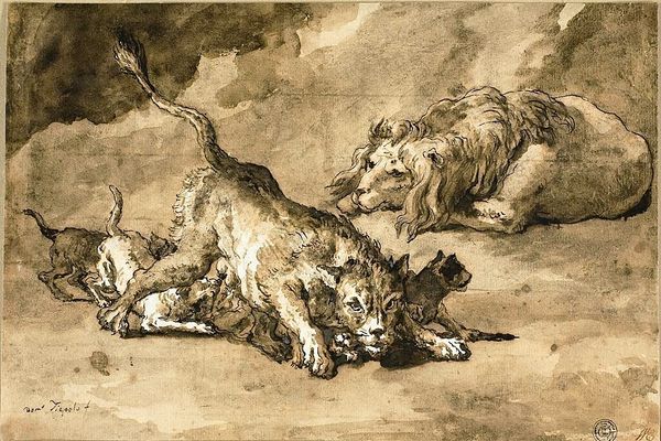 Curator: This is Eugène Delacroix's "Lion and Alligator," painted in 1855 using oil paints. Editor: Right off the bat, it's got a dramatic feel! Sort of murky light, and a definite sense of predator-prey tension playing out. Curator: Absolutely, Delacroix captures that intensity. This painting reflects an ongoing fascination of the time with exotic animals and dramatic scenes. The focus on the raw power of nature aligns strongly with the Romanticism movement. Editor: Romanticism loved a bit of theatricality, didn't it? This is less about objective reality and more about stirring feelings of awe and even terror. The slightly blurred details amplify that, making it more of an impression than a crystal-clear depiction. Like he wants us to *feel* the scene. Curator: He really wants us to consider that fine line between dominance and vulnerability, a frequent theme in Romanticism. There is such violence in it but you almost feel sympathy for the alligator. Delacroix had made studies in zoos, so, for the painting to still look staged speaks volumes. Editor: So, thinking about its cultural impact, how did a painting of exotic animals presented as almost mythic reflect back on how people viewed colonialism or power dynamics at the time? Curator: That's a very astute question! These images served to reinforce notions of European superiority. Paintings like this allowed people to vicariously experience exotic lands and conquer nature without leaving their homes. The display of the subjugation of a dangerous animal speaks to the presumed control that society has over its environment and the unknown "other." Editor: I guess the image hits differently today, now we see animals less as representations of 'wild otherness' and more as part of an interconnected ecosystem under threat. Curator: Exactly. Our evolving relationship with the natural world changes the way we interpret these artworks, adding new layers of complexity to an already rich image. It goes to show the influence of visual imagery in influencing perceptions and reflecting sociopolitical realities. Editor: Thanks! Something to really ponder as you observe Delacroix’s intensity on the canvas.