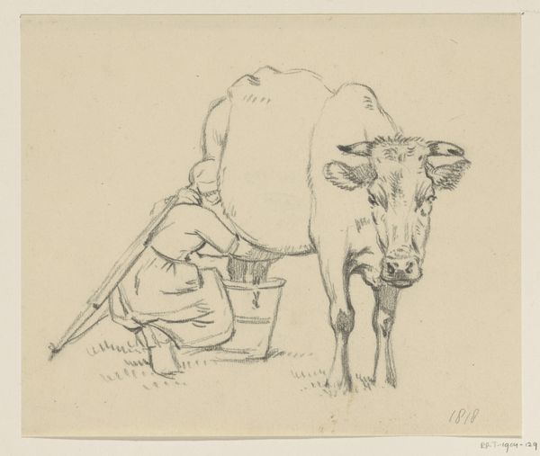 Curator: Take a look at this subtle piece titled "Melkmeid," or "Milkmaid," by Pieter de Mare, estimated to be from between 1768 and 1796. It’s a pen drawing on paper. Editor: My initial reaction is to notice how simply it’s rendered. The stark lines give a sort of ethereal quality, almost as if this everyday pastoral scene is only half there. Curator: Indeed. Consider the labor involved in depicting rural life with such refinement. The milkmaid is the focal point, her task rendered not as arduous toil, but with an almost delicate grace, even though this drawing certainly stems from the laborious process and tradition of representation itself. Editor: I am struck by the placement and rendering of the subjects. Notice the positioning of the figures and how each shape—the seated cow, the milkmaid herself, even the relaxed lamb—contributes to a dynamic interplay. How much of the intent in portraying those dynamics can be gathered from the means with which it was drafted, pen on paper, ink as media, negative space to insinuate an unstated but familiar sense of landscape? Curator: One might view this work as documentation of labor and its products. Milk production in this era involved an entire economic and social structure. De Mare's piece engages in these existing dialogues and frames them in simple and comprehensible ways. His sketch, through lines, gives substance to that which he depicts. Editor: It is more than just a sketch: consider its visual structure. Note the deliberate choices that render it far from rudimentary. Observe how the composition directs our gaze, how line and form subtly inform us beyond the sketch’s material means, toward the conceptual design in plain sight. Curator: What resonates with me most profoundly is contemplating the milkmaid’s material reality juxtaposed with our modern consumption and art spaces. How different is her labor from, say, the labor involved in extracting pigments for painting, and ultimately displaying and storing her image here at the Rijksmuseum? Editor: Yes, and beyond those interesting questions around materials and process, one can view this image through form itself—observing what visual ideas are at play, by way of De Mare’s design.