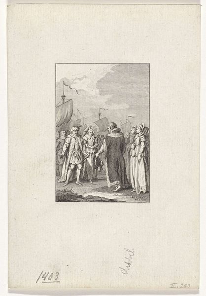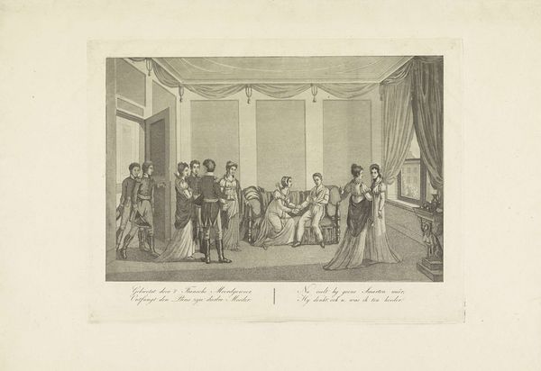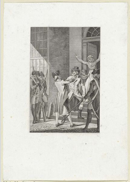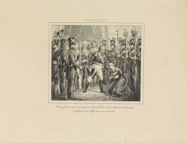 This print by Jean-Louis Van Hemelryck, made around 1829, captures a moment of social tension. It's rendered through etching, a process where lines are incised into a metal plate with acid, then inked and printed, creating a delicate but reproducible image. The choice of printmaking speaks volumes. Unlike a unique painting, prints are inherently democratic, allowing ideas to circulate widely. Here, the scene depicts King Willem I allowing a man with a petition to approach him, surrounded by other men. The print captures the tension between rulers and the ruled, with a strong sense of immediacy. Van Hemelryck has made design choices that emphasize the relationship between the different parts of the social order. The formal dress of the King and his retinue sharply contrasts the clothing worn by the common folk, making distinctions of labor and class apparent in the image. By using an accessible medium like etching, Van Hemelryck amplifies this dynamic, underscoring how materials and making can be deeply intertwined with the political and social context of their time. It reminds us that even seemingly simple images can carry complex messages about power and access.