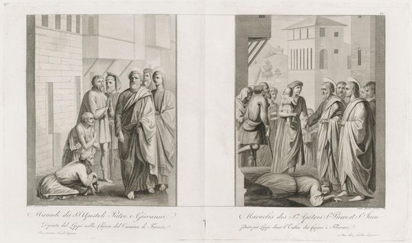 Curator: This is Carlo Lasinio's "Zacharias Writes that the Boy Shall Be Called John," housed here at the Harvard Art Museums. The moment feels hushed. Editor: It's the quiet drama of the ink and pen against all those observing figures, and their finely rendered robes. What do you make of it? Curator: Look closely at the architectural setting, the arches receding into the distance. It establishes a clear hierarchy, framing Zacharias as the focal point, emphasizing the social rituals being performed and witnessed. Editor: The engraving technique itself is so deliberate, creating an almost sculptural quality despite the flatness of the print. It’s all about tonal contrasts, directing our gaze. Curator: Right, and consider how Lasinio, as a printmaker, is participating in a network of image production and dissemination, bringing religious narratives to a wider audience through these reproducible means. Editor: Ultimately, it captures a fleeting moment, rendered with such precision, that it speaks volumes about faith and determination. Curator: Indeed, a convergence of material process and historical narrative. Editor: A beautiful, simple rendering.