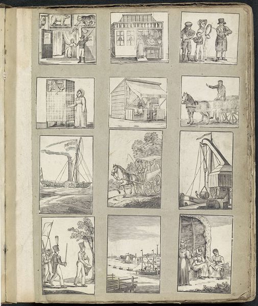 Curator: This intriguing album page from between 1814 and 1869, attributed to Alexander Cranendoncq, presents a delightful array of scenes executed in pencil and ink on paper. Editor: My immediate impression is one of curiosity. There’s such a range of subjects compressed onto this single page—military scenes, genre paintings, even animals! It feels like a miniature encyclopedia, almost. Curator: Precisely. Each vignette acts as a tiny window into the world. Look at the repeated use of military iconography: the soldiers, the cannons... Clearly, the Napoleonic era left a significant mark on the visual imagination. The recurring figure of the soldier in various states possibly speaks to anxieties of war. Editor: And consider the materiality: the deliberate use of pencil and ink, suggesting perhaps sketches from life, quickly rendered. This also hints at accessible production. It suggests perhaps not commissioned artwork, but studies of subjects who piqued his interests, available cheaply for personal consumption. Curator: That’s insightful. These were undoubtedly images created and enjoyed amidst a rising middle class hungry for accessible imagery. There's even a conscious embrace of the miniature. The scale reinforces this sense of intimacy, echoing memory. They're not just pictures but mnemonic devices. Editor: Absolutely. The close observation of various social types as well speaks volumes. And that touch of exoticism in those depictions of other cultures; even the strange composite image of a seal is intriguing. The accumulation and cataloging is fascinating—reflecting colonial desires. Curator: Yes, that tension between documentation and categorization is present throughout. This is no mere collection of images; it's a statement about ordering, seeing, and processing the world. We might ask: what story, in totality, is being built across these individual works? Editor: From the perspective of process, I am equally fascinated by the labor implied: how much time was allocated to this single album page? And where might we place this piece within the wider circulation of images that emerged from popular prints in 19th-century Europe? Curator: The range of subject matter speaks, I think, to a very typical tension between narrative and portraiture. There are anecdotal representations here, contrasted with precise capturing of the military characters’ essence through stance and costume. Editor: Overall, this image acts almost as a fascinating testament to an artist wrestling with an influx of a huge volume of imagery made possible by new reproductive technologies of the era. The images here offer just an outline of an artist grappling with his time.