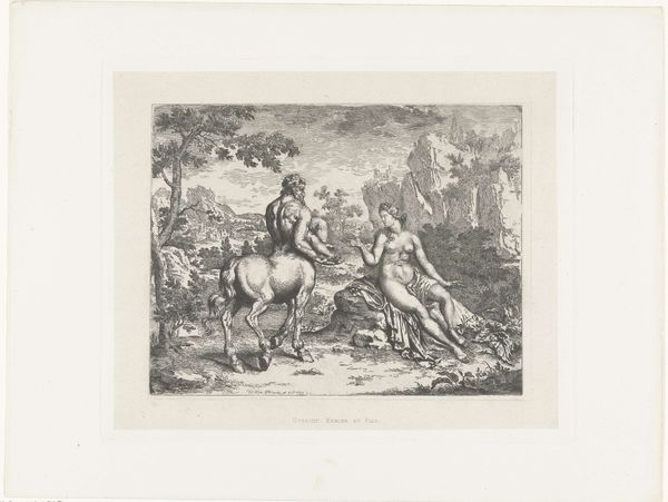 This image of a Centaur Family, of unknown date, was created anonymously using engraving. The artist would have used a tool called a burin to cut lines into a metal plate, likely copper. Ink is then applied to the plate, and then wiped off the surface, remaining only in the engraved lines. Finally, paper is pressed against the plate, transferring the ink and creating the print. The engraver's skill is evident in the detailed rendering of the centaurs and their woodland environment. The fine lines create a sense of depth and texture, bringing the mythical creatures to life. But the medium also speaks to a broader shift in visual culture. Printmaking enabled the wide distribution of images, catering to a growing market for art among the middle classes. This print, therefore, reflects the rise of a new economy of art, where skilled craftsmanship met the demands of an expanding consumer base. Thinking about the labor and materials involved in its production helps us to appreciate its historical context. It reminds us that art is not just about individual genius, but also about the social and economic forces that shape its creation and reception.