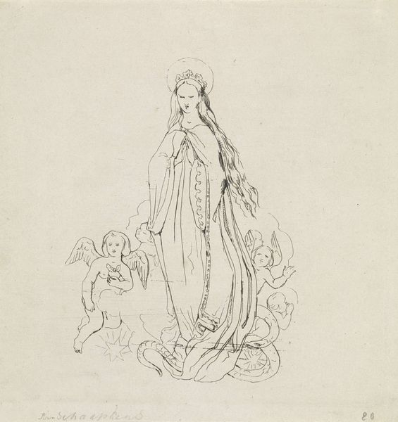 Pierre Laprade created this etching, "Woman Gathering Flowers," using metal plate and acid, a departure from traditional drawing. The etching process allows for finely detailed and repeatable imagery. A metal plate, likely copper or zinc, would have been coated with a waxy, acid-resistant substance. Laprade would then draw through this coating, exposing the metal beneath. When the plate is submerged in acid, the exposed lines are eaten away, creating grooves. Ink is then applied to the plate, filling these grooves, and the surface is wiped clean. Finally, the plate is pressed onto paper, transferring the image. The resulting image is one of light and shadow. Look closely at the woman’s dress, and how the cross hatching suggests both form and texture. This method allows for a kind of draftsmanship that is both delicate and precise, reflective of the skill involved in printmaking. Understanding the labor and skill involved reminds us that what might appear as a simple sketch is actually the product of a complex process, blurring the lines between fine art and craft.