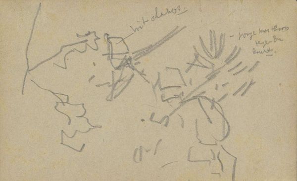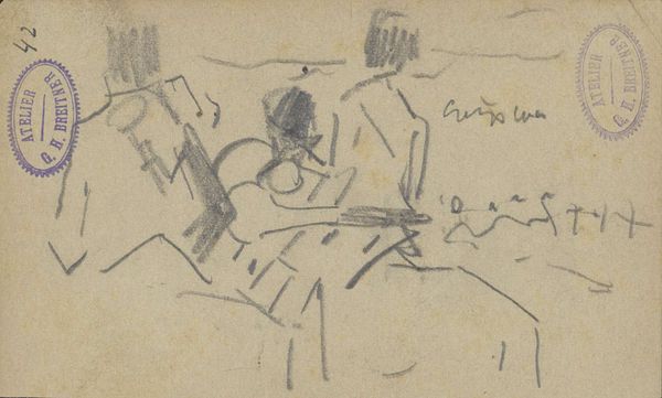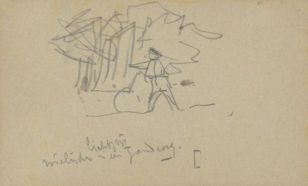 Editor: So, here we have a very delicate pencil sketch titled "Studie, mogelijk van figuren in een landschap," or "Study, possibly of figures in a landscape" by George Hendrik Breitner, dated sometime between 1882 and 1912. It’s on toned paper, and the light pencil work gives it a rather dreamlike, ephemeral quality. I’m immediately drawn to its sense of quiet contemplation. What catches your eye, what's your interpretation? Curator: Dreamlike, exactly! It’s funny, isn't it, how something so minimal can evoke so much? To me, this feels like a fleeting memory captured on paper. Breitner wasn’t aiming for photorealism here; instead, he’s offering us a glimpse into his own artistic process, the way his mind sifted through visual information. Look at the sparseness – it's like he’s distilling the essence of the landscape. Almost like haiku but with a pencil. Do you get the impression he was really *seeing* this scene or simply feeling it? Editor: Feeling it, definitely! There's something so personal and intimate about sketchbook art. I wonder what he was trying to capture? The light, maybe? The mood of the scene? It almost feels as if we are intruding in someone's private journal. Curator: Perhaps all those things! He was known for his impressionistic cityscapes. Perhaps this sketch was Breitner working out the spatial arrangement and mood for a larger composition. This is the bones of a thought...What do you suppose a finished version would look like? Editor: Maybe more detailed figures? I never thought of the "impression" of impressionism being so incredibly direct! Like a quick brain download. Curator: Precisely! The directness, that raw energy…it's a window into the artist's mind, unfiltered. This sketch has really encouraged me to appreciate this stage, that fragile thought-form. Editor: I’m beginning to look at sketches with fresh eyes! Now I understand a little better how to begin to try to see through an artist’s eye. Thanks!