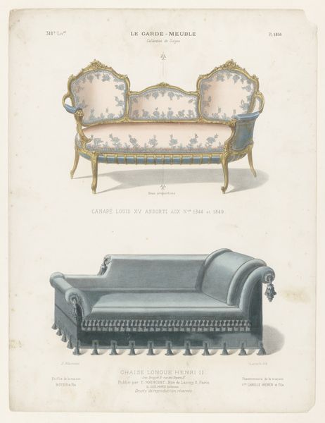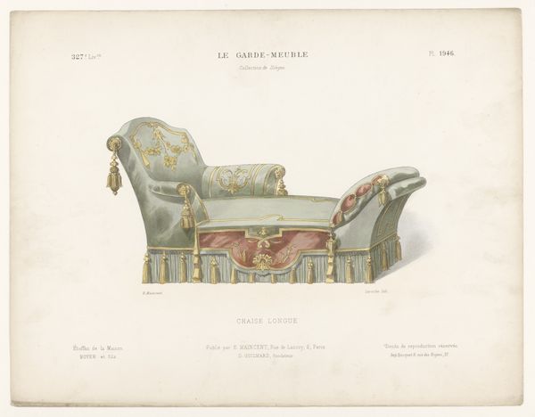 Editor: Here we have LéLaroche’s “Chaise Longue,” dating from 1885-1895, rendered in watercolor and drawing. It's so delicate, almost ethereal. How would you interpret this piece? Curator: Ah, yes, a whispered promise of leisure! For me, this evokes not just a piece of furniture, but a dream. Look at the pastel hues, like faded memories, and the gilded flourishes which remind me of spun sugar. It embodies the Rococo style's love for the ornamental and playfully erotic, a flirtation with decadence. Imagine the stories this chaise longue could tell, the secrets whispered upon its cushions... Doesn't it make you want to invent a romantic narrative around it? Editor: Absolutely! The level of detail is amazing; what strikes me is that while it is visually beautiful, it also functions as a sales catalogue of sorts. Curator: Precisely! The tension between art and commerce! These decorative art pieces blurred those lines exquisitely. Each detail meticulously rendered, intended to entice potential buyers. Laroche is selling us an ideal. A vision of refined domesticity. And dare I say, he's doing a fabulous job! Do you notice any symbolism that attracts your attention? Editor: Now that you mention it, there’s almost something unsettling, and not necessarily "erotic" with the excessive amount of detail here. What seems beautiful at first also feels superficial. Curator: Ha! So, the rococo spell breaks for you... But that's precisely what's compelling! It reveals the artificiality of those courtly pleasures. You’ve perfectly picked up on its latent critiques! It's beautiful precisely *because* it acknowledges its own constructed nature. Editor: I see, I came looking for surface but found something deeper. Curator: Isn’t that always the most rewarding journey with art?
