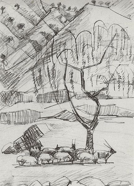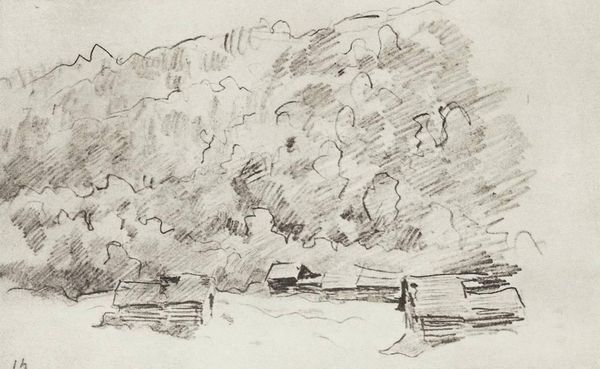 Curator: Here we have "Landscape with a Runaway Team" created in 1921 by Niels Larsen Stevns, employing charcoal and pencil on paper. It is held at the SMK, the National Gallery of Denmark. My first impression is organized chaos! Editor: I feel that too! It's the untamed rawness of the strokes. Look at how Stevns builds up the pines using dark marks, creating form, depth, and movement with relatively few strokes. He is creating a kind of controlled frenzy. The texture is fantastic, raw, unfinished. Curator: Precisely. The apparent spontaneity masks considerable deliberation. This isn’t just about representing a scene; it’s an investigation into the dynamic tension between control and abandonment inherent in artistic labor. The paper's support is interesting in this sense as well: he is creating this piece using easily accessible and mobile material. It speaks of sketching from life and perhaps acting as an emotional register too. Editor: I like that "emotional register," because you are right. Look at that wild team of horses, all rendered in furious slashes! The artist definitely had a need to set down this energy that is about to explode right off the page! The runaway team echoes something internal. A moment of being out of control in a physical landscape. Curator: That runaway quality reflects larger social anxieties, perhaps linked to the social and political turbulence of the era after World War One. Even his quick material choices--the charcoal, the pencil--facilitated immediate expression. This resonates within the rapid industrial advancements in a country whose agricultural structure defined a vision of slower labor. It's a reflection on those contradictions within Denmark at this moment in time. Editor: Well said. It brings us back to the image of that horse, straining. Maybe all creativity has an aspect of that desperate race... it could also be that society in its new faster tempo also felt close to careening off of the track, with little agency as to stopping that gallop. Curator: That's the brilliance here; the drawing captures a potent combination of immediacy and reflection. Stevns asks a question, it doesn’t necessarily give answers, even a century later, don't you think? Editor: I do think. I now leave this image feeling both exhilarated and slightly off-kilter... definitely thinking more critically than when I walked in!