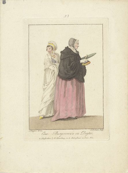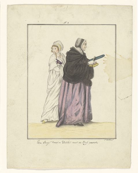 Curator: Here we have "Moeder en dochter op weg naar de kerk," or "Mother and Daughter on their Way to Church," by Ludwig Gottlieb Portman, created sometime between 1803 and 1829. It's a drawing made with ink on paper, housed here at the Rijksmuseum. Editor: Oh, it's like stepping into a Jane Austen novel. The colors are so delicate, almost faded, like memories. I feel a strange mix of serenity and… confinement? Does that make sense? Curator: It does. The piece resonates strongly with Romantic ideals of the era. Consider the societal pressures, particularly on women regarding piety and reputation. This work opens a dialogue around prescribed gender roles, class expectations, and the public performance of religious devotion. Editor: Exactly! The mother, cloaked in what seems like respectability—that somber black—feels almost weighed down. The daughter, though, in her white dress… there's a hesitant lightness, a flicker of resistance maybe? Or am I just projecting? Curator: Not at all. The artist uses costume effectively. The stark contrast could symbolize generational differences in embracing religious expectation. The mother's formal attire speaks to tradition, while the daughter’s paler clothing could hint at an emerging sense of self. Where does individual identity fit within societal expectation? Editor: It's those subtle hints, isn’t it? That upward glance of the daughter, like she's looking for an escape route in the clouds. And the fan she’s holding… is it for comfort, or is it a prop in this performance? It feels deeply melancholic somehow. Like a stage where they have to play a role. Curator: Portman’s choice to depict this intimate, yet public, moment encapsulates the Romantic era’s complex negotiation between personal emotion and social decorum. How are the characters in this everyday drama complicit in the social dynamics of the moment? What does it say about women and religion? Editor: Gosh, you make me think… that even on their way to find spiritual solace, they are actually en route to reinforce an established order. I’m just sitting here, wondering what the daughter might choose, if she were given the chance, rather than simply falling in step. Curator: Precisely. Portman gives us so much with such delicate means, creating room to really explore these unspoken, systemic ideas, so charged at the time. Editor: Well, now I have a whole new understanding of "Sunday best." It's less about dressing up and more about performing duty. Powerful stuff from such a seemingly gentle picture.