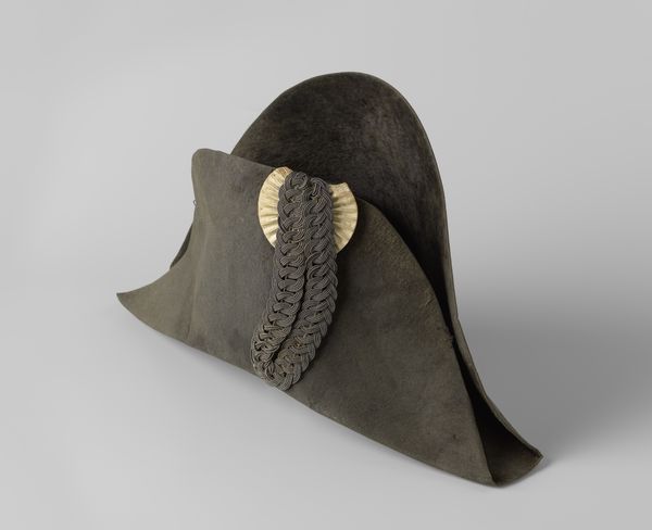 Curator: What we have here is a hat from around 1789 to 1810, a "Ronde rouwsteek van zwart haarvilt, versierd met zwarte struisveren en een zwarte lis over een oranje strik," or "Round mourning stitch of black hair felt, decorated with black ostrich feathers and a black lis over an orange bow" crafted by G. Nijman. Looking at it, it's quite striking. Editor: Yes, it certainly has a dramatic flair, almost theatrical, with the intense black and those plumes. What statements were these fashion accessories attempting to communicate to society? Curator: It speaks volumes about the wearer's identity within a complex societal structure. Mourning attire, particularly for the elite, became increasingly codified in the late 18th century. The ostentatious display of grief, indicated through lavish fabrics and dramatic silhouettes, also inadvertently revealed a lot about the complex economic realities in Europe and burgeoning notions of colonialism. Editor: So, it's less about simple mourning, and more about a visual language that encodes economic and societal narratives? How did people "read" this hat at the time? Curator: Precisely! Black, the color of mourning, also served as a symbol of wealth. The type of material used and its crafting reflect broader intersections with gender, race, and even colonial structures of exploitation and ownership. Considering the date, wouldn't you agree it resonates with social ideas that sparked, for example, the French Revolution? How is mourning visually displayed and understood in contemporary society? Editor: Fascinating. It makes you realize how even seemingly simple objects can hold entire worlds of meaning. Thanks for making me see this piece through that lens. Curator: And thank you for allowing me to share my viewpoint!