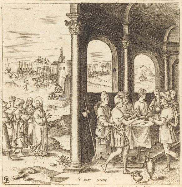 Albrecht Altdorfer created this woodcut, "The Last Supper," part of "The Fall and Redemption of Man" series, using bold lines to define form and space. The composition, though small, feels monumental, dominated by the figures gathered around the table, set against an arched, windowed backdrop. The dense, cross-hatched lines create a dramatic contrast, heightening the emotional intensity of the scene. The light emanating from Christ destabilizes the pictorial space, drawing attention to the theological weight of the moment. Altdorfer uses the starkness of the woodcut medium to emphasize the themes of sacrifice and spiritual revelation. Notice how the artist's formal choices—the compressed space, the dynamic lines, and the strategic use of light—function beyond mere illustration. They create a symbolic language that engages with broader questions of faith, redemption, and the human condition, inviting endless interpretation.