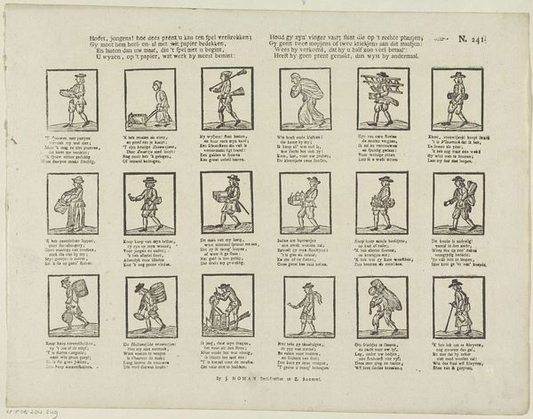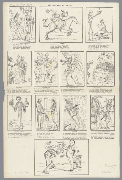 Curator: This whimsical piece is titled "Kaartspel / Nr. 1. / Harten," tentatively dated between 1843 and 1920 and credited to J. Beeg. It appears to be a lithographic print. My immediate impression is a certain chaotic charm. Editor: Indeed, chaotic yet meticulously organized, in its own way. The eye bounces between these miniature scenes, each a little vignette rendered with surprising detail. Curator: Exactly. The artist employs a dense network of lines to construct forms and textures. Consider the stippling effect used to create the volume of the figures' clothing, contrasting with the clean, precise outlines defining their silhouettes. Editor: It strikes me as a satire, a commentary on various social rituals. The costumes are so expressive; one might interpret these as theatrical archetypes. Curator: I would agree. Consider the historical context. Such prints were often disseminated through illustrated journals, acting as accessible forms of social and political commentary, reaching wide audiences in urban centers. The visual language relies on a shared understanding of contemporary society, but speaks across years too. Editor: Precisely. Observe how these tiny dramas unfold—scenes of courtship, of leisure, even conflict. Note that heart motifs subtly connects each image. It lends itself well to our understandings of comic strips or cartooning. Curator: The lack of color certainly forces us to focus on the forms themselves. The composition relies on contrast - light and shadow define depth but flatten images at once. It is both illustrative and expressive, but the tonal range and details give the figures definition. Editor: Thinking about its reception, it is possible to read this art, perhaps, as both celebratory and critical; is Beeg simply recording social life, or is there something subversive intended? Curator: I’m particularly drawn to how this work manages to be both incredibly precise and delightfully playful in its execution, like looking into someone’s personal sketchbook. Editor: A compelling glimpse, indeed. The more we see the artwork as connected to print culture the more it serves the society to come and the previous one that informed it.