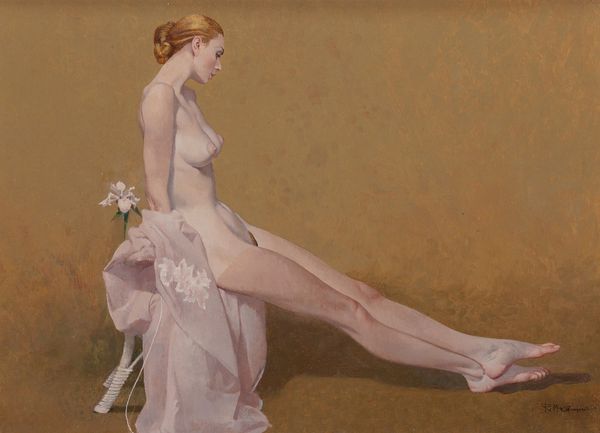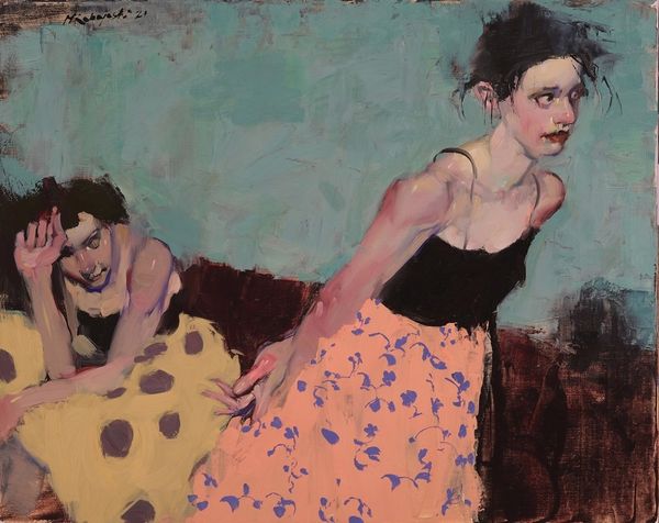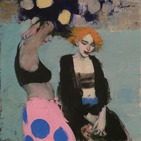 Editor: This is Milt Kobayashi's "The Pink Tutu," painted in 2021, using acrylics. I'm really struck by the contrast between the delicate pink tutu and the dancer’s rather world-weary expression. What story do you think the artist is trying to tell? Curator: Oh, I think it's less about a specific story and more about a feeling. Kobayashi captures that moment of quiet introspection, that breath a performer takes before or after stepping into the spotlight. You almost get a sense she is about to face some life changing challenges and be exposed for the world to see. Editor: I see what you mean. There’s definitely a sense of vulnerability. Curator: Absolutely. And I'm drawn to the raw brushwork. It’s almost Neo-Expressionist in its energy, but Kobayashi also manages to convey a real tenderness. He presents the image of being "lost", where it might hurt when they make mistakes, or it might just feel great. Do you pick up on that balance? Editor: Definitely! It’s there in the composition too, isn't it? The softness of the tutu against the harsher background... almost unfinished brush strokes. It's not overly romanticized. Curator: Exactly! The image has "layers." In an emotional context that most might not comprehend. That kind of vulnerability resonates in today's world and beyond time itself. Art allows those perceptions to the canvas and the ability to last indefinitely. So tell me, do you think it speaks to you, with the vulnerability showing within the painting? Editor: I do. It definitely challenges the typical perception I might have of a ballerina, and that makes it memorable. Curator: Well said. And that’s the magic, isn't it? To see beyond the surface, find the soul hiding within those brushstrokes and understand art for generations. Editor: Thanks, I'm seeing that so clearly now. It's a wonderful gift!