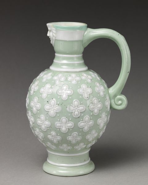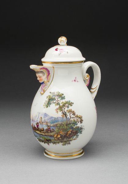 Curator: Welcome. Today, we are examining a striking ceramic piece entitled "Jug," crafted around 1775 by the Worcester Royal Porcelain Company. Editor: It's instantly captivating, this porcelain jug. The monochrome palette gives it such a sophisticated air. The narratives wrapping around the jug are like stories waiting to be unfolded. Curator: Precisely! The monochrome effect arises from the printing technique used on porcelain. It also invites exploration of its layered creation: the base form, the glazing, the etched narrative, all working in tandem. The narratives, for example, appear to reflect idyllic pastoral life, rendered during England's Enlightenment era. Editor: It evokes a certain longing for a simpler, idealized past, doesn’t it? Note how those idyllic scenes clash subtly with the grotesque mask below the spout. I find it a curious blend of harmony and disturbance—like a dream laced with unsettling undertones. The iconography invites layers of psychological interpretation. Curator: I'm equally fascinated by the formal, functional dimensions of the object. Porcelain, developed through precise mixtures and high-firing processes, represents technological innovation and intense labor—its fragility also implies value and careful handling. It reminds us that objects held immense social and economic significance within consumption practices. Editor: Material certainly dictates our perception, yet symbols are rarely confined. That idyllic pastoral life, a running symbol throughout 18th-century decorative arts, hints to something far more elaborate—status, wealth, ownership. This piece is an intersection of craftsmanship and encoded meaning. Curator: True. Seeing the artwork from these distinct vantage points allows for more expansive considerations. The Jug represents the intersection of material innovation, social ambition, and enduring aesthetic appeal. Editor: I leave feeling a bittersweet nostalgia, prompted by symbols and rendered complete through exquisite crafting, sparking connections across history.