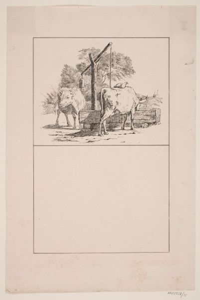 Curator: Looking at Adolph Kittendorff's lithograph, "De to heste," from 1845, I'm immediately struck by the intimacy it portrays despite the simple composition. Editor: It does have a quiet, almost melancholic air. Two horses nuzzling, sketched so delicately—it's sweet but also… subdued. It feels small, even vulnerable in all the negative space. Curator: Lithography, particularly with graphite, was a common means of distributing images widely in the 19th century. Considering the political climate and the emerging bourgeois interest in the pastoral, we might ask: what did images like this signify for the rapidly changing Danish society? Was this meant to evoke ideas around harmony, peace, and national identity through the image of these horses? Editor: I think you’re on to something regarding national identity. Horses often represent freedom and power, certainly masculine power, but in this context, do they perhaps also signal a desire for simpler times, removed from industrialization, as a direct reference and maybe also a silent protest? And aren’t they quite literally yoked? I mean, one is white and one is brown— Curator: That’s a very important observation! The stark contrast, so prevalent in rendering race, becomes striking. By visualizing those together, and in such intimacy, Kittendorff presents a unique commentary about partnership between apparent opposites—not only contrasting gender/race, but more of unity to resist outside pressures. It is rare to find depictions such as this where the animals express gentle affections rather than competition. Editor: It does challenge the conventional narratives—and does so implicitly and quietly—avoiding immediate confrontations with social conventions. This artwork might operate almost as a visual allegory, suggesting new types of interpersonal relationships by taking them away from a place of just domination, a novel suggestion, no? Curator: Absolutely. Exploring the material history and the contemporary reception helps us unearth layers of social messaging often embedded in even the most seemingly innocuous works of art. I never would have expected it on the first glance. Editor: Yes, and considering its subtlety alongside the potent underlying messages it is truly rewarding and deeply affecting.