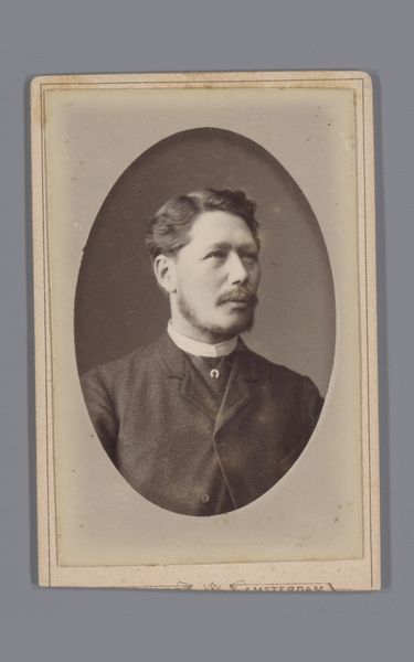 This silver gelatin print, titled "Portret van Dirk Haan," was created by W.G. Kuijer & Zonen. The portrait's composition is classically formal, with Dirk Haan centered within an oval frame, set against a neutral backdrop. The tonal range emphasizes a somber mood; the dark suit, bow tie, and muted skin tones are all carefully balanced within the photographic print. Consider how the deliberate use of monochromatic shading affects our perception. The symmetrical layout and even lighting create a structured, almost architectural presentation of the subject. This is not just a likeness, but a carefully constructed image meant to convey certain qualities about the sitter and their social standing. The oval shape of the photograph and the stark contrast between the subject and the background creates a sense of depth within a small space. The portrait is both an observation and a presentation of self.