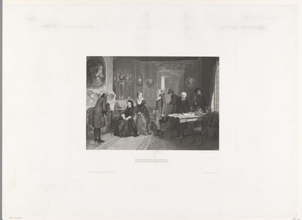Curator: Welcome. Here we have "Falstaff and His Friends, 'The Merry Wives of Windsor,'" an engraving rendered in 1868 by William Greatbach, currently residing at the Metropolitan Museum of Art. Editor: Oh, what a scene! It's all contained revelry, isn't it? A great gathering humming with gossip and goblets. Curator: Indeed. Observe how Greatbach employs a relatively muted tonal range within the engraving, establishing a controlled yet dynamic composition. Notice how the light articulates the textures and forms, carefully structuring our gaze across the scene. Editor: It’s interesting that you mention "control," as my eye darts every which way, like a restless guest! There’s so much to see. I’m caught between the intimate huddle around Falstaff and the larger gathering near the back of the hall. I feel pulled into this play—both a welcome observer and perhaps a slightly unwelcome intruder. Curator: Precisely. The artist orchestrates visual tensions. The faces are particularly well-articulated, conveying character and emotion. This exemplifies the genre painting approach, vividly portraying a narrative through a focus on individual personalities and interpersonal dynamics. Editor: It almost has the quality of theater, wouldn’t you say? Everyone seems to be "performing" their role—gesticulating or whispering, holding flagons aloft or hanging on to every last bit of the conversation. Falstaff’s self-important bulk dominates, anchoring all these theatrics. Curator: True. Through compositional balance, Greatbach juxtaposes different perspectives, providing a layered interpretation. Consider how each element—the table settings, the interior architecture, and even the clothing—functions as a signifier within a structured visual language, offering further cultural and historical insight. Editor: For me, it all converges around the story—that bubbling tension just before the plot thickens. I wonder, what will happen next? It is that sense of expectancy, of dramatic narrative, that breathes such engaging life into the print. Curator: Indeed. A culmination of narrative drama carefully laid upon structural balance. Thank you for lending us your insights. Editor: My pleasure entirely. Thank you.