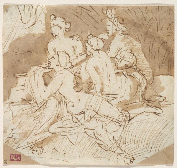 Curator: Leon Kossoff's "Bacchanal before a Herm (1)" presents a whirlwind of figures in what appears to be a frenzied dance. Editor: My first thought is chaos, but a purposeful chaos. The line work is so energetic, almost manic; you can practically feel the heat and sweat of the revelry. Curator: Yes, it's evocative of ritualistic transgression, perhaps reflecting societal release, the challenging of norms through ecstatic experience. We should consider the bacchanal as a historically gendered space, often excluding women, but Kossoff's treatment seems to question this. Editor: It's interesting you mention gender, because the lines here seem deliberately coarse. It reminds me of how printmaking, with its reproducible nature, democratizes artmaking by challenging the hierarchy of unique, painted images. Curator: Precisely! Kossoff utilizes this method to potentially subvert established structures both in the art world and the social sphere. The piece resonates with a sense of liberation. Editor: A liberation etched in hurried, frantic lines, a testament to the power of process mirroring the energy of the bacchanal itself. Curator: A valuable interpretation, focusing on how material and method underpin meaning. Editor: Indeed, and a reminder of how process reflects broader social dynamics.