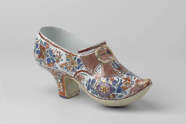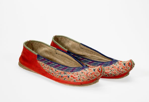 This pair of shoes, of unknown date and origin, presents a striking composition of color, shape, and texture. The dominant reds and blues, combined with the decorative gold embroidery, create a vibrant visual experience. The shoes, with their elongated, pointed shape, feature an intricate design that draws the eye across the surface. The use of geometric patterns, meticulously stitched, contrasts with the smooth, flat planes of color, creating a dynamic interplay between ornamentation and form. These patterns, reminiscent of traditional motifs, suggest a deeper cultural context. The materiality of the shoes, combining leather, fabric, and metallic thread, further enhances the sensory experience. The formal elements here evoke the cultural coding of adornment, perhaps challenging notions of simplicity and utility. As we contemplate these shoes, we are invited to consider how artistry and identity are intricately interwoven.