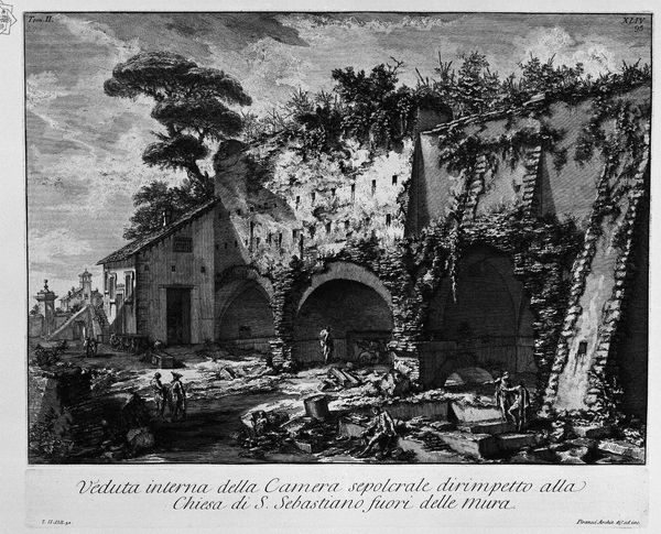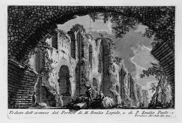 Curator: I shall guide you with an orientation concerning “The Roman Antiquities, t. 1, Plate XVI” a print, etching, and drawing by Giovanni Battista Piranesi, circa 1756. A chaotic beauty unfolds from it. A world dissolving into decay. Tell me, what is your initial reading? Editor: Thanks, that sets it up nicely! When I look at this piece, I am really struck by the contrast between the intricate details and the overall sense of ruin. The architecture feels very solid, yet nature is reclaiming everything. How do you interpret this contrast? Curator: Note how Piranesi meticulously renders the textures of stone and foliage. How does this visual approach amplify the inherent tension between enduring architectural forms and the organic forces of nature’s reclamation? Look closely, does this contrast enhance or diminish the emotive depth? Editor: I think the level of detail definitely heightens the emotion, creating a sense of awe and also loss. Are there any other visual techniques that stand out to you? Curator: Consider the perspective. Piranesi employs a deep, almost theatrical perspective that invites the viewer into the scene. How does the stark chiaroscuro contribute to the composition’s dramatic quality and, consequently, the narrative? Editor: Yes, it’s like we’re on a stage set that is also falling apart! I am now seeing the work's temporality in new ways, as architecture, carving and landscapes combine and change with time. Thank you. Curator: An acute observation that reflects upon history’s material implications, and our relation to those things lost.