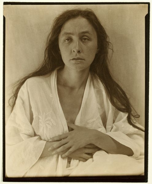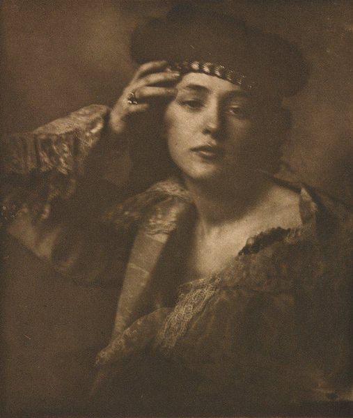 Editor: This is "Anaïs Nin drapée dans un châle," a 1932 photograph by Brassai. The draped fabric gives the image a certain theatrical quality, almost like a still from a play. What strikes you about the formal qualities of this portrait? Curator: I am drawn to the interplay of textures and the composition's geometrical underpinnings. Note the contrasting surfaces: the smoothness of her face against the intricately patterned shawl. How do these juxtapositions function within the image? Editor: They definitely create visual interest, preventing the monochrome palette from feeling flat. Is the stark contrast the defining component of the image? Curator: It is the delicate equilibrium of forms, balanced on the picture plane through value and scale relationships. Consider how the dark vertical stripe at the background anchors the composition, offset by the shawl's complex folds on the right. The eye traces these volumes and lines to constitute the image. Editor: So, it’s less about the subject and more about the organization of visual elements? Curator: Precisely. Brassai utilizes light and shadow to create depth, transforming a potentially flat surface into a three-dimensional space. The semiotic power of clothing helps carry our sight through the plane of the picture. Did you notice a similar effect? Editor: I was focused on the figure at first, but I see what you mean about the compositional structure dictating my movement across the image. This way of seeing art transforms one’s engagement with it. Curator: Indeed. Formal analysis grants us tools to perceive how the work's components work together to convey artistic merit. Editor: This close examination gives me a greater appreciation for the artist's intentions and technical skill. Thank you for your insight.