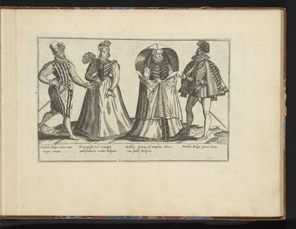 Curator: This print by Abraham de Bruyn, dating from before 1581, is titled "Four Country People Dressed in the Italian Fashion of circa 1580." It resides here at the Rijksmuseum. What are your first thoughts? Editor: They look like they’re straight out of a play! So stiff, self-conscious even. I mean, fabulous outfits, don't get me wrong, but there's this peculiar, almost theatrical, distance between them and us. They seem caught in a moment. Curator: The artist uses engraving to delineate each figure meticulously. Observe the clear outlines and precise details of the clothing, allowing us to study the sartorial codes of the era. Each stands independent of the other; notice that the space between them seems intentional, creating distinct formal arrangements. Editor: You are right. They're more like meticulously labeled specimens. Each crease, each fold tells a story—though I’m not sure what it is, precisely! The artist certainly had an eye for fabric; I mean, look at the way light seems to catch on the puffed sleeves! And those hats! Utterly divine. Curator: It seems De Bruyn deliberately avoids imbuing any anecdotal warmth within the image, as if prioritizing details of garments over emotions or expressions. Through the figures’ constructed symmetry we see clear markers of status. The formal composition suggests we’re dealing with types, or rather models, of regional identities and cultural fashion. Editor: Models is the right word! Perhaps like early fashion plates. There’s something appealing in the strangeness of their almost cartoonish presentation; that hyper-clarity almost transforms into something else. Like looking at historical emojis! It strikes me also, these faces and figures reflect an idea of place – something perhaps truer to concept rather than actuality. Curator: It is a striking observation. The artist sought less to capture lived reality, but perhaps a semiotic field: signifiers of the rustic experience. Editor: A semiotic field – yes! Still, one can't help wonder about the real lives behind those severe stares and elaborate costumes. But maybe, that's not the point. Perhaps this print is an invitation, even if unconsciously, for us to see beyond the lines. Curator: A fitting reflection on a fascinating piece that highlights how cultural identities can be formed, viewed, and conveyed. Editor: Indeed. De Bruyn has opened up, even after all this time, many avenues for reflection and, not a little, personal projection.