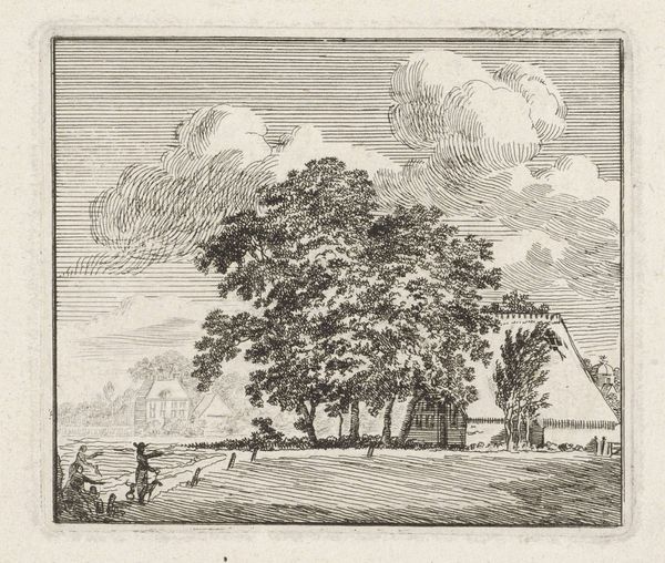 Franciscus Andreas Milatz created this landscape etching, "Landschap met hoge bomen langs een rivier," using delicate lines to define form and texture. The composition is anchored by the large trees that dominate the foreground, their canopies filling the upper portion of the frame. The artist's etching technique renders a complex interplay of light and shadow, giving depth to the foliage and implying movement in the leaves. The eye is drawn along the river, which winds into the distance, balanced by the placement of figures along its bank. Milatz masterfully uses linear perspective to create a sense of depth and to structure the composition. The river recedes, and our gaze follows it into the background. The structural arrangement invites reflection on how landscapes can be both a scene and a constructed space, prompting considerations of nature as both a physical reality and a symbolic construct. In its formal structure, this etching offers an ongoing exploration into the nature of seeing and interpreting the world around us.
