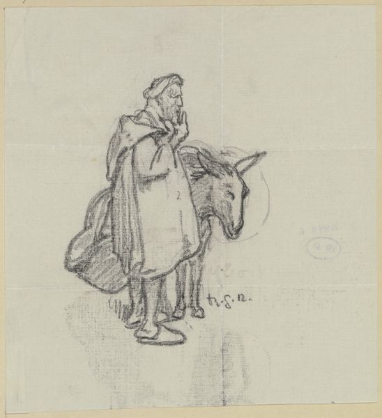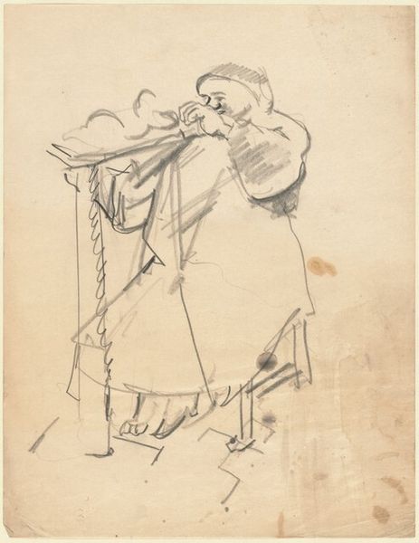 Curator: I'm immediately struck by the delicate and transient nature of this image; it’s very ethereal, almost like a faded memory. Editor: Indeed. This is Christen Købke's pencil sketch from 1836, entitled 'Skovshovedkone, siddende,' housed right here at the SMK. It's a genre painting rendered simply in pencil on paper. What is it that draws you into its feeling of ephemerality? Curator: It’s in the slightness of the lines. They suggest rather than define, especially around the figure's face and the undefined basket on the right. I also see an earlier draft of a hand near her elbow, which makes me wonder about the choices Købke made as he worked. Does that reflect Romanticism’s focus on process and individual subjectivity? Editor: Definitely. The visible corrections provide insight into the artist’s process. Köbke was working within a very particular Danish cultural and artistic context. There was great interest in depicting the everyday lives of ordinary people, which you can see in the subject matter itself, even with the rough quality of the drawing. What I also find compelling is how this depiction is connected to national identity. Curator: I see what you mean! The headdress that the woman wears is itself symbolic, acting almost as an icon for the local Danish woman and her work. It reminds me of similar head coverings used in other cultures as markers of identity. The image transcends simple portraiture; it evokes archetypes and ideas around feminine roles and cultural values. Editor: And by rendering it in this understated, almost vulnerable way, he acknowledges not only the beauty of everyday life, but maybe also the hardships. In portraying a ‘Skovshovedkone’ - a woman from Skovshoved, known for fishing - he highlights the often unseen labor of women. This links to the social and economic conditions of the time, even if only subtly hinted at. Curator: So, this sketch captures not just a portrait but also the faint whispers of cultural narratives about labor, gender, and the development of national consciousness through artistic expression. Editor: Precisely. It is remarkable to consider all of those contexts and meanings evoked from just a few simple lines.