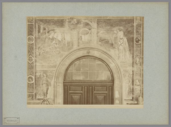 This photograph captures an interior view of the Paushuize in Utrecht. The anonymous photographer focuses on the architectural integration of art within the space. Notice how the composition is divided into distinct yet interconnected visual planes. On the left, a large, framed painting dominates, its arched top echoing the shape of a classical proscenium, suggesting a theatrical presentation of history or mythology. The figures within the painting appear to be engaged in a formal gathering. To the right, a doorway is crowned with a relief sculpture. The sculpture seems to illustrate another narrative, possibly a moral or allegorical scene. The photograph's muted tones unify these elements, emphasizing their shared architectural context and decorative function. The photograph's composition invites us to consider how art is used to construct meaning within a space, where each piece—painting, sculpture, door—contributes to a larger narrative or ideological framework.
