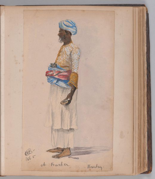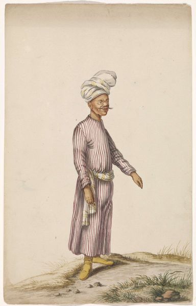 Louis Ducros created this small watercolor drawing, titled "Kadi van de islamitische slaafgemaakten op Malta," which translates to "Judge of the Islamic slaves on Malta." Notice the artist's emphasis on line and shape to define form within the composition. Ducros uses delicate, precise lines to depict the figure of the seated Kadi, emphasizing the contours of his clothing and facial features. The muted palette, dominated by whites and soft pinks, creates a subdued, almost ethereal quality. The composition centers on the figure, but it is his posture and props that are doing the most work. The Kadi is depicted with a long smoking pipe. This functions as a symbolic indicator of status but also of cultural difference, marking him as 'other.' The formal qualities, therefore, intersect with the complex politics of representation and cultural identity. Ducros offers an interpretation of power dynamics and cultural otherness.