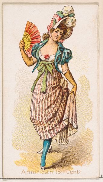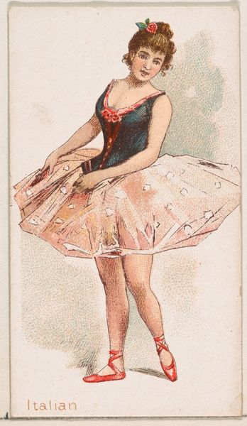 Editor: This is "Cuban Dancer" from the Dancing Women series, made in 1889 by William S. Kimball & Company. It looks like a drawing, made with coloured pencil and then printed. I'm struck by the sort of flattened perspective, which reminds me of ukiyo-e prints. What's your take on this, looking at it as an art historian? Curator: What interests me is the mass production of this image and its function as a trade card for Wm. S. Kimball & Co., a cigarette manufacturer. The colored pencil drawing wasn't intended as high art; instead, it was part of a larger system of commodity culture. Editor: So you're saying it's less about the art and more about... selling tobacco? Curator: Exactly. Consider the materials. Inexpensive paper, colored pencils allowing for quick reproduction – everything points to efficient, low-cost manufacturing. This contrasts sharply with the traditional art world's emphasis on unique, handmade objects and durable precious materials like oil paint and canvas. Where does it fit into impressionism beyond its appearance? Editor: Right, I see your point. It looks like art, but it's really advertising, mass-produced and ephemeral. So, it’s a challenge to those traditional boundaries. Curator: Precisely. The image’s value resides not in its aesthetic qualities, though they are appealing, but in its role in the distribution and consumption of a widely available product, linked to female representation as a spectacle and the labor involved in producing these images en masse. Do you see this print any differently now? Editor: Yes, completely. I was initially drawn to the image itself, but now I'm thinking about all the factory workers who probably cranked these out. Curator: And that changes how we understand the “art,” doesn’t it? It reframes our consumption of art by examining labor and materiality, blurring those traditional boundaries.