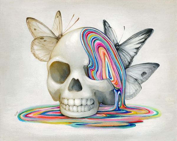Editor: This is Camilla d’Errico's 2020 piece, "Mortum," rendered with acrylic paint. It immediately strikes me as both whimsical and a bit morbid, a real visual contradiction. What are your thoughts when you look at this, Professor? Curator: Ah, "Mortum." A potent concoction, isn’t it? I’m reminded of those bittersweet dreams – vibrant, but tinged with the shadow of something…ending. The skull, that ancient symbol, now weeps a riot of colour. Does it evoke tears of sadness, or perhaps the ecstatic overflow of memories? And that darling little fuzzball creature perched atop... is it a herald of doom or a quirky observer? Editor: I hadn't considered the memories aspect. So the colours...they represent memories? Curator: Perhaps. Or maybe it's the vibrant essence of a life once lived. What do *you* think they symbolize? Think of colours: how do you feel when you wear blue compared to bright red? Consider how our experiences seep into our interpretation, staining it with personal meaning, don't you think? Editor: That’s a really good point. Red feels aggressive to me; blue feels calm, so a mix… a full life lived, maybe. Curator: Exactly. And look at the blurring between pop-surrealism, portraiture and caricature – it throws everything into joyful ambiguity. Mortality isn't necessarily dour, here, is it? This is the surrealism of self; who the painter _is_ coming through, bright yet solemn, sweet and melancholic, all mixed as one. Editor: That changes my entire perception of it. It is like one’s essence pouring out! I never would have gotten there on my own. Thanks! Curator: Art, you see, is often about stumbling upon yourself while attempting to understand another. A worthy journey, wouldn't you agree?