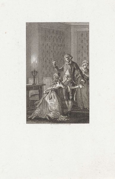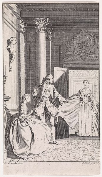 Curator: This print by Jan Punt, created around 1740, is titled "Young Woman Departing." It's an engraving that speaks volumes about societal roles and hidden power dynamics. Editor: My initial feeling is one of quiet desperation. The high contrast lends a dramatic flair to this moment of perceived entrapment. Curator: Entrapment, that's a potent word choice. The woman, dressed in an enormous Baroque gown, is physically restrained, a small fan clutched in her hand almost defensively. Editor: Absolutely, restrained! You see how the man is seizing her arm. There is also the shadow figure of someone sitting on a sofa. Is she caught? Cornered like a frightened animal? It makes one consider what social constraints existed. Curator: The composition cleverly uses interior space to comment on that social control, I think. Look at the baroque decorations and the shadowing that contributes to a sense of depth, while paradoxically the overall staging of the three figures is very compressed. And you might say that her own fashion imprisons her, no? Editor: The gown practically cages her. And the stern, possessive stance of the man, is echoed by the watching shadow of another. Who knows what trap lies beyond that stagey drawing-room interior? Is the picture simply an episode in a play, or a satire of aristocratic manners? Curator: Indeed, its title *'Le Tartuffe'* certainly points towards it as a stage scene, and therefore more likely the latter. It gives us insight into Jan Punt’s political agenda through social satire in art and culture of that era. Editor: So interesting how a seemingly simple image holds so much to interpret. Perhaps its resonance lies in the ongoing conversations around agency, then and now. Curator: It highlights those timeless tensions, doesn’t it? It is a frozen second, which allows us, even now, to reflect on broader societal issues of gender relations, power and even morality.