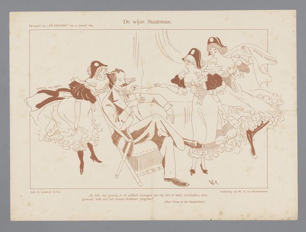 Editor: This is a poster, "Affiche pour Chansons Galantes door Paul Delmet," from 1899. It feels very dreamlike, with all these figures fading into a hazy background. What's striking to me is how the public sphere, signified by the cityscape, intermingles with private moments. What do you see in this piece? Curator: Well, seeing this poster, I immediately consider the explosion of printed imagery in late 19th-century Paris. It wasn't just about advertising; it was about constructing a public identity, shaping desires, and dictating what was "en vogue." Paul Delmet, leveraging names like Leonce Burret to prefice his works, understands this well. Notice how the lithography emphasizes both artistry and commercial appeal, blending symbolism with the urban landscape. The act of disseminating culture in print normalizes and shapes taste. The image of public enjoyment is directly linked with private, purchased ownership of this "Nouvel Album". What do you think this relationship illustrates? Editor: I guess it’s saying that cultural experiences were becoming more of a commodity? Was there a tension between art as high culture and as a form of mass entertainment? Curator: Absolutely. Artists like Delmet navigate this tension carefully. The style of the poster mimics art nouveau aesthetics—elevated taste—but its purpose is decidedly commercial: to sell albums, shape musical preferences and cement reputations. We see this "Chansons Galantes" poster operating on the streets, in cafes and shops, embedding Delmet's work within the very fabric of Parisian life. Did this change your initial understanding of this poster's dreamy ambiance? Editor: It does! It seems less spontaneous and much more deliberate in its cultural placement. I initially saw a romantic scene, but it's also part of a calculated marketing strategy. I see now it shows how art creates a market around its vision of reality and its dissemination. Thanks!