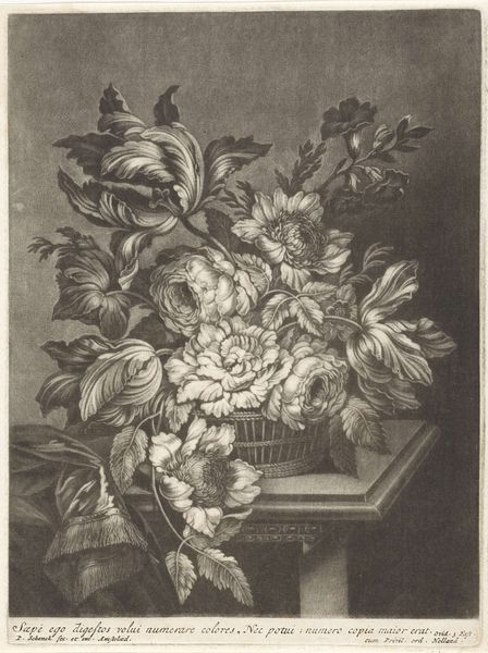Editor: My first thought? Stark elegance. The monochromatic palette gives it a very refined feel. Curator: Indeed. What we’re looking at here is “Vaas met bloemen,” or “Vase with Flowers,” a drawing dating back to sometime between 1700 and 1750, made by an anonymous artist. Notice the detail, the rendering of the various textures achieved through, seemingly, solely through the use of lines and their varying densities. Editor: Precisely! And look at the way the light reflects on the vase—almost as if it's made of polished metal. Do you think that indicates it might have been based on an actual object of value, signaling wealth? Curator: It's quite plausible. The selection and arrangement of flowers would also likely carry symbolic weight within the societal context of the piece. Editor: Thinking about the craft involved… Imagine the hours of labor required for such meticulous work with pen and ink. What type of paper would have been available, what were the ink-making practices of the time? Was this an artist creating luxury items on commission, or something else entirely? Curator: Those are crucial points. And it underscores the traditional boundaries questioned by these works – it hovers between a scientific record, decoration, and perhaps even memento mori. Look at how each petal is painstakingly delineated to build form, almost mathematically. Editor: So it's this interplay, right? The precision of the marks versus the almost overflowing, untamed beauty of the bouquet itself. This is echoed by the tension between naturalistic form and clear artifice. Curator: Yes, it highlights the formal arrangement of elements to evoke this concept of ‘nature,’ when truly it's about control, artifice, and the power dynamics embedded within that era. Editor: In looking more at the contrast, this feels remarkably forward. The interplay between the dark background and light foreground provides real emotional depth, as do the high level of detail and precise pen work. Curator: It’s quite interesting to look at both the minute labor involved and the total, composed design of this anonymous work. Editor: Absolutely! Getting to explore the creation of the vase adds another layer to how we comprehend this piece.