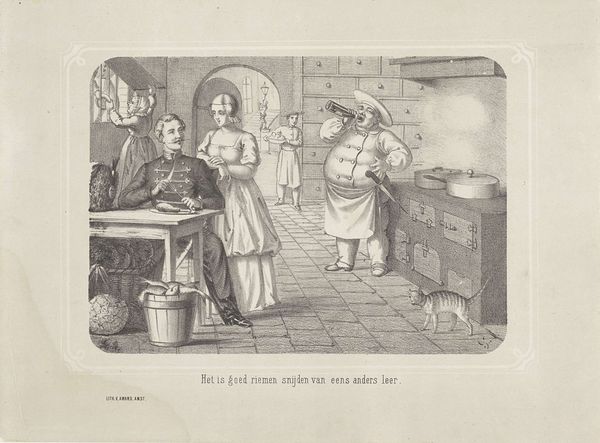 Curator: We are looking at "Man in Harlequin Suit with his Mother in the Kitchen," a lithograph created by Paul Gavarni around 1839. It's part of the Rijksmuseum's collection. What strikes you about this image? Editor: Oh, it’s wonderfully melancholy. Here’s this flamboyant Harlequin, right? Costume, the works… but slumped in what appears to be his mother’s rather drab kitchen. The juxtaposition just sings of lost dreams, or maybe a hangover. It’s brilliantly downbeat. Curator: Gavarni frequently explored the tension between societal roles and private realities. The Harlequin is a classic symbol of wit and performance, but here, he seems stripped bare, the colorful costume contrasting starkly with the domestic setting. What do you read from that? Editor: It makes me think about how often we play a part, put on a mask. This isn't just about theatre, is it? Think about our jobs, our families… how often do we fully, authentically present ourselves? This poor guy is probably regretting some disastrous decision, hoping mum's got a cure for that dreadful existential feeling... plus some aspirin, hopefully. Curator: I agree that there’s a palpable sense of vulnerability. But also, consider the kitchen as a traditionally female space, a space of nourishment. Could this image be suggesting something about the limitations placed upon artistic expression, the artist’s need for grounding, for sustenance beyond the stage? Editor: Hmmm, limitations. Sure! Although part of me also thinks this could just be a perfectly timed moment, before this silly fellow trots back out to make more mischief and merry with everyone else. Is the stove implying a potential burning of ambitions? Curator: Symbolically, that stove may reference an everyday hearth, so the creative energy comes from something elemental or familial. His attire stands out, suggesting the enduring cultural weight these symbolic characters carry. Editor: True, it really brings home this bittersweet reality - even harlequins need a cup of tea and a good moan to their mothers now and again! Well, I for one feel like visiting my mum... maybe wearing a brightly colored outfit next time, why not? Curator: Indeed! It makes us wonder about the person behind the costume. Thank you for the thoughtful commentary.