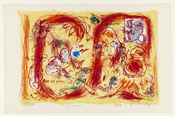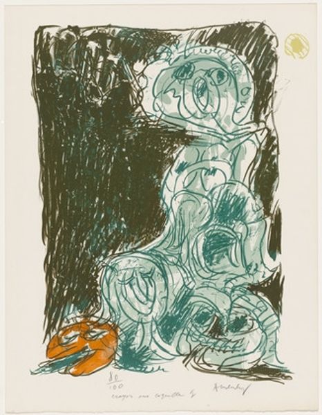 Curator: Before us, we have "Aleching," a 1963 mixed-media piece on paper by Pierre Alechinsky. It’s an intriguing blend of ink drawing and painting, deeply embedded within the Art Informel movement. Editor: My initial reaction is chaotic, yet contained. The swirling lines and blots of ink evoke a sense of unrestrained energy, but it's all carefully framed. The colour palette feels bold yet somehow organic. What am I looking at here, really? Curator: Considering its context, it feels almost defiant. Post-war, there was this strong pushback against traditional artistic norms, and Alechinsky, along with the Cobra group, sought a more raw, spontaneous mode of expression that could break through ideological constraints. They were looking for art that communicated pure human feeling. Editor: I can definitely sense that raw feeling in the unbridled lines. See the recurring motif of the circle, and within the circle, the suggestion of monstrous forms – it seems almost Jungian, tapping into universal anxieties. The symbols suggest atavistic terrors lurking just beneath the surface of the conscious. Curator: Indeed. We need to acknowledge that the so-called "universal" is invariably viewed from a white European vantage, particularly at mid-century. What I see is a challenge to that presumed authority. A deconstruction of aesthetic hierarchy mirroring social hierarchies. The scribbles, splatters...they become an assertion of self against ingrained artistic hegemony. Editor: Yet the visual language has precedence in earlier periods. Think of cave paintings, shamanic art--even, say, Leonardo's ink blots intended to evoke hidden forms. Perhaps this expresses humanity's continued attempt to reach past words towards universal understanding that has been hidden, distorted, or overlooked by traditional patriarchal institutions. Curator: Perhaps, or, we can examine its effect: The ink-splash technique becomes, perhaps, the mark of resistance, a refusal of fixed narratives in art, reflecting wider anti-colonial sentiments growing then. "Aleching" is not merely expressive; it's demonstrative of its political environment, a critical articulation in visual form of this changing moment. Editor: I see your point. It's a provocative piece. The symbols resist singular interpretations, fostering engagement. It leaves us wondering about humanity and memory. Curator: A powerful example, in fact, of how personal expression also holds collective, critical power.