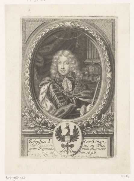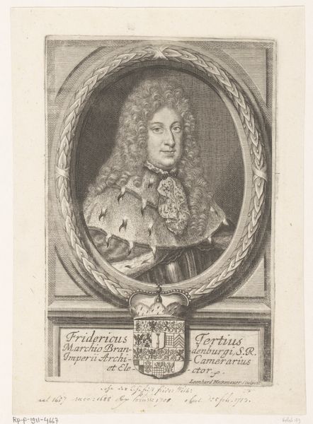 Editor: This is a portrait of Christian Ulrich II von Württemberg-Oels, made in 1707 by Martin Bernigeroth, using engraving. The detail is amazing! But what strikes me most is how he’s presented, almost like a Roman emperor but with that enormous Baroque wig. What symbols are at play here? Curator: Precisely! Look closely: Bernigeroth employs several visual cues that tie Christian Ulrich to both ancient Roman power and his contemporary standing. Consider the armor—a symbol of military prowess harkening back to antiquity, yes, but juxtaposed with the fur-lined cloak. What does that suggest to you? Editor: Luxury and status? It feels like the artist is balancing his military image with signs of wealth and nobility. Curator: Indeed. The text below adds another layer. Being "Rector Magnificientissimus" suggests that in addition to titles of nobility, Christian was a patron of arts and culture, implying the transfer of military power to knowledge power. Do you see any potential tension there? Editor: Definitely. It is a statement about inherited power but also individual accomplishments, creating a dialogue between legacy and identity. He has agency. Curator: Exactly! By understanding how different elements symbolize Christian Ulrich’s position in society, we unlock a richer comprehension of Baroque values. Images like this reveal that the symbols accumulate across different cultures and eras, revealing how power is perceived across different communities. Editor: I see how the image functions not just as a portrait but also as a symbol of Baroque-era power and authority, and the cultural inheritance that follows power. I’ll certainly be thinking about this duality in future encounters with art.