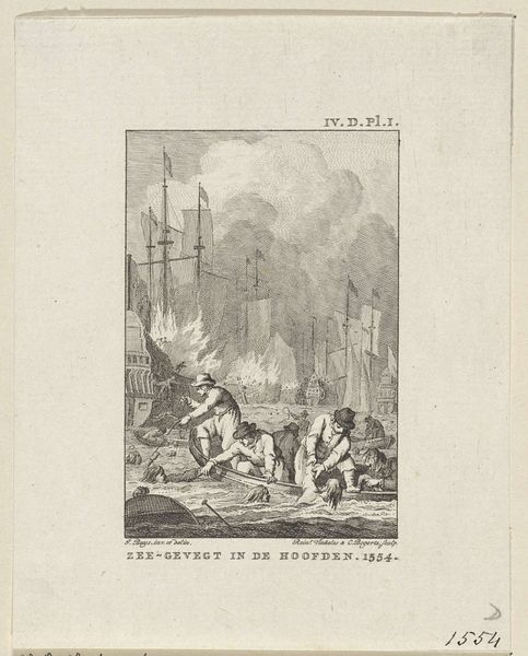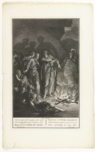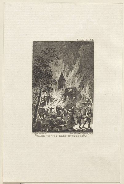 Curator: Here we have "Joden vluchten uit een brandend huis," or "Jews Fleeing a Burning House," an engraving on paper created in 1784 by Cornelis Bogerts. It's part of the collection at the Rijksmuseum. What are your initial impressions? Editor: Chaos. My eye is immediately drawn to the stark contrast of light and dark – the frenzied figures are highlighted against the raging fire, which in turn is emphasized by the stormy sky. The diagonal composition intensifies the feeling of panic and instability. Curator: Absolutely. This print provides insight into a complex moment in history, one where the Jewish community faced intense persecution. Images like this, circulated through print, played a critical role in shaping public opinion. Who is being centered and who is being scapegoated is the central element here. Editor: Yes, there’s a strong Baroque influence in the dramatic lighting and emotive figures. Observe how the artist employs line to convey the terror and urgency of the scene. Note the textural differences—from the smooth skin of the fleeing figures to the jagged, uncontrolled lines depicting the fire. Curator: The composition definitely speaks to larger historical trends and patterns of religious persecution in 18th-century Europe, which were a period where Jewish populations were targeted with expulsion and violence based on prejudice and false accusations. It would be important to consider, who commissioned the work? Editor: Considering that, this piece uses an economy of means to communicate so much narrative and emotion, Bogerts uses the basic elements of art—line, form, contrast—to create a really strong feeling. The technical skill of the engraving enhances the viewing experience and reinforces the horror. Curator: Reflecting on the social context of this engraving, its power rests not only in the artistic choices, but also in its potential to provoke dialogue around displacement, resilience, and social responsibility. Editor: Indeed. Through a careful analysis of the composition and formal qualities, this work reveals the visual language of crisis, providing the audience with a potent view on historical narratives of the time.