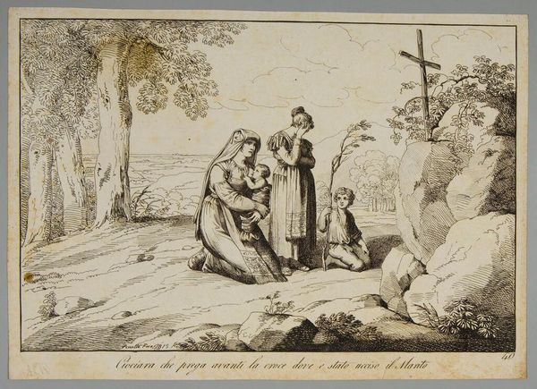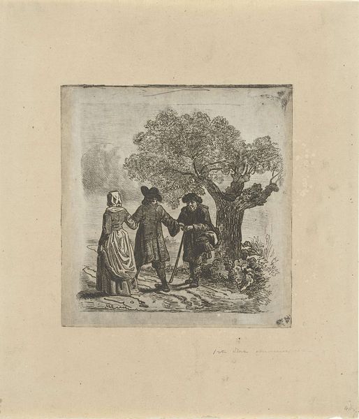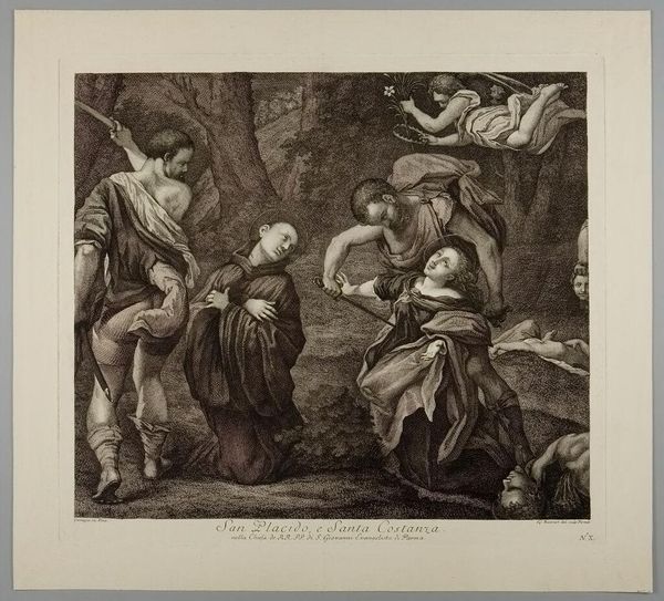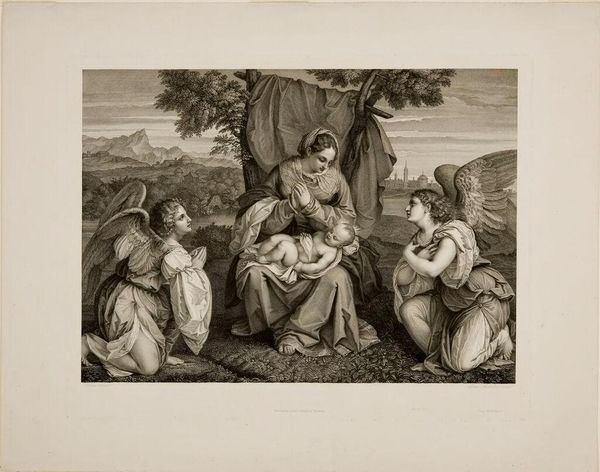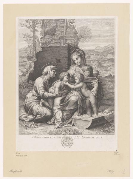 Curator: This is Domenico Cunego's "Visitation." Editor: There's a beautiful sense of quiet anticipation here, almost like a whispered secret being shared between the figures. Curator: The image depicts the meeting of Mary and Elizabeth, a pivotal moment in Christian theology pregnant with symbolism, especially regarding the power dynamics and narratives of female relationships. Editor: Right. It has the feel of a sacred encounter, yet I love the intimate, human connection that Cunego captures. It feels so tender. Curator: Cunego, drawing from earlier interpretations of this scene, frames their meeting within broader patriarchal structures, note the male figures in the periphery observing the encounter. Editor: Interesting! The framing definitely tells a story of societal observation versus intimate experience. Well, I'm now seeing so many layers to this simple embrace. Curator: Indeed, it speaks volumes about power, faith, and the gaze.