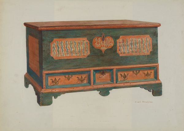 Curator: This watercolor drawing is titled "Pa. German Chest," and it’s attributed to Betty Jean Davis, dating from around 1935 to 1942. Editor: It evokes such a feeling of… domestic tranquility. The muted greens and browns, the careful draftsmanship, they all suggest a quiet reverence for everyday objects. Curator: I agree, though I’m drawn to consider what this chest signifies within the broader context of Pennsylvania German cultural identity during this period. Think about the revival of interest in folk art and craftsmanship as a response to industrialization and mass production. It’s an interesting commentary on consumerism. Editor: Absolutely. And the imagery! Cloverleaf shapes repeated on the doors, geometric rosettes… Aren't these echoing a history of Fraktur and the symbols tied to religious beliefs and agrarian life? Are we seeing representations of good fortune and protection here? Curator: Precisely. Pennsylvania German folk art often functioned as a powerful visual language, communicating values of community, faith, and connection to the land. Davis’s depiction captures this intricate system through a lens shaped by her time and perhaps the then dominant aesthetic preferences. Consider, also, how gender roles intersected with craft traditions. Whose labor produced these chests originally and how did that work impact those identities? Editor: This reminds me of my grandmother's house. She had something similar in her attic... These kinds of objects represent not only the history of people, but also a material cultural that can hold an intense psychological value. What's more fascinating than objects being charged with all these complex memories? Curator: That's precisely why art history must also engage with critical theory and memory studies. What narratives are privileged in museums? What stories are suppressed? Even a seemingly simple watercolor drawing like this opens up vast avenues for exploration into questions of power and representation. Editor: Seeing it through that prism deepens its emotional resonance and elevates it far beyond simply the aesthetics. It's about ancestry, memory, and legacy. Curator: Indeed. "Pa. German Chest" encapsulates the intersection of art, history, and lived experience, and through this understanding can we really appreciate this art work. Editor: A visual portal into individual and collective history, indeed. Thanks for taking me with you on that journey.