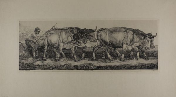 Pieter Dupont made this etching of oxen, sometime in the past, using a fine-lined technique. Look at the way the image is built up, almost like he is drawing, bit by bit, stroke by stroke. The whole thing feels immediate, like you’re watching the process of discovery happen right there on the plate. There’s an honesty to the texture. Everything is clear and present. I like the feeling that Dupont wasn't trying to hide anything. The oxen and the farmer are defined with a wonderful, raw energy. Take a look at the leading pair of oxen, how they seem to bulge with effort, a real sense of muscular tension in their shoulders and hindquarters. You can almost hear the creak of their yokes and the grunts of labor. The way he captures light and shadow makes the scene feel like a moment captured, a fleeting glimpse into the everyday life of the countryside. The conversation between artists is always ongoing, and here I think of the Barbizon School, especially artists like Millet, who found beauty and nobility in the lives of ordinary people.