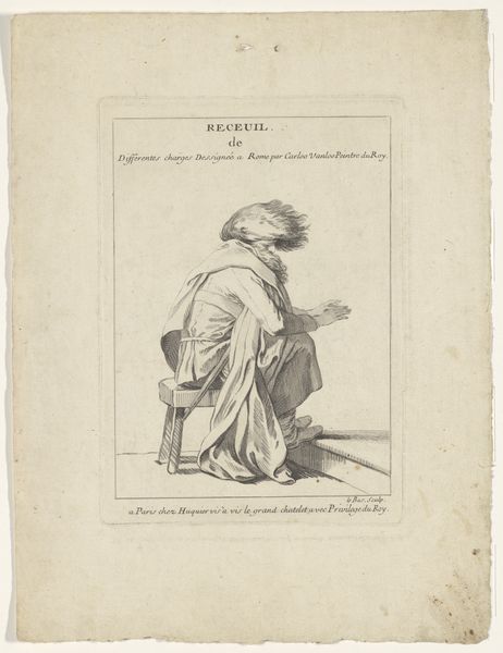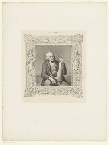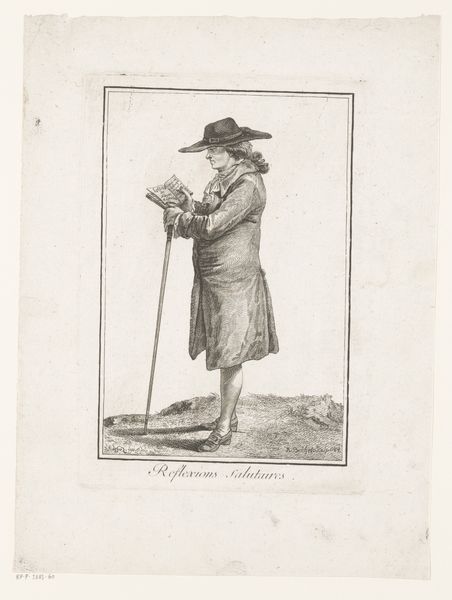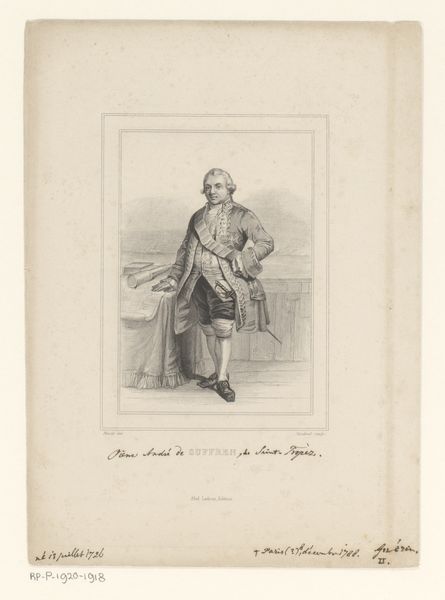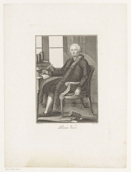 Editor: This is "Portret van dichter Girolamo Pompei" made sometime between 1783 and 1840 by Luigi Rados. It's a print, an engraving… giving us this very formal portrait of a poet in thought. What leaps out at you when you see this image? Curator: Well, first off, it's delicious isn't it? This perfectly poised gentleman! One foot nonchalantly crossed, propped up against a neoclassical architectural fragment in a little bosky landscape. I see a portrait striving for immortality, or perhaps better stated, a considered performance *of* immortality. He seems suspended, lost in some delicious reverie. What do you make of his attire? Editor: I noticed it’s not overly ornate for the time period. A fairly simple coat, and is that some kind of gaiter? It makes me wonder about his social status and the statement he’s trying to make. Curator: Exactly! The relatively understated dress points toward a leaning on intellectual prowess rather than ostentatious wealth – the clothing implies an ‘accessible intellectual.’ Plus, that slight air of melancholy— do you see it? Almost Hamlet-esque. This engraver is composing a narrative, wouldn't you agree? It’s carefully, cleverly composed, much like a poem, and intended to suggest not just a likeness but also a state of mind. It's Neoclassicism meeting Romantic sensibility. Editor: So, the artist is using both visual cues and maybe some tropes of the time to give the viewer an impression of the poet's inner world? I hadn't thought about it as a narrative. Curator: Precisely! And Rados really encourages us to meet the poet in that quiet contemplative space. Consider the texture in the soft lines used… I'm struck by a true harmony in simplicity. Editor: I never considered how much personality can come across, even in what looks like a straightforward portrait. It's making me see this piece with entirely fresh eyes! Curator: It just goes to show how much a single image can whisper, if we are ready to listen!