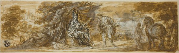 Editor: This is Reginald Marsh's "Couple on the Beach," from the 1940s. It's a drawing rendered in monochrome, sandy brown tones, and it has such an intimate, almost voyeuristic quality. How do you interpret this work, seeing it through a materialist lens? Curator: Consider the labor embedded in its creation. Marsh, known for his depictions of everyday life, likely produced this drawing rapidly, perhaps en plein air. How might the immediacy of that act influence our reading of the couple’s pose, their relaxed state, or the composition? Think about Marsh’s relationship to his subject; he is producing an image of leisure while actively laboring. Editor: That's a really interesting point about the labor. So, by choosing this ordinary scene on a beach, is Marsh commenting on consumerism in leisure, particularly how it was evolving in the 40s? Curator: Exactly! Look at the way Marsh uses the paper itself. It’s not obscured or hidden; it becomes an integral part of the composition. This acknowledges the materiality of art-making, breaking down traditional distinctions between high art and the mundane reality of production and its inherent capitalist aspects. Marsh is also known to be influenced by past art, incorporating Renaissance and Baroque figure drawing; thus it’s useful to consider his source materials when exploring his work. Editor: I never thought about the paper itself contributing to the narrative. It definitely gives it a raw, unfinished feel. Curator: Precisely. The rawness pushes us to question: what materials are readily accessible for the average beachgoer, how does it inform artistic agency? In this piece, materiality shapes how we experience and comprehend not only art but also the culture within which this imagery becomes consumable. Editor: That’s a fresh take. It's amazing to realize how much material consideration can change our perspective on the image. Thanks! Curator: Indeed. Viewing art with the awareness of material reality helps unlock deeper interpretations and societal reflections, beyond simply seeing its surface beauty.