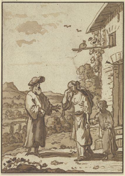 Editor: So, this is "Abraham Entertaining the Angels," an ink drawing made between 1610 and 1620 by Jan Tengnagel. The line work gives the scene a nervous, energetic feeling. What stands out to you when you look at this piece? Curator: What immediately grabs me are the symbolic layers within this seemingly simple biblical scene. Consider how the motif of hospitality recurs throughout history and its depiction here, signaling cultural values tied to generosity and divine favor. Look at the contrast: Abraham, rendered with distinct earthly attire and grounded stance, versus the ethereal winged beings at the table. Doesn't that contrast of human and divine tell a compelling story about encounter and exchange? Editor: That's interesting, I hadn’t considered the theme of hospitality as a kind of symbol itself. Does the specific act of dining together have a particular significance? Curator: Absolutely! The act of sharing a meal carries profound symbolic weight. Throughout many cultures, breaking bread signifies trust, peace, and community. Think of the Last Supper, or even contemporary business lunches! Tengnagel uses this familiar image to convey not just hospitality, but the blurring of boundaries between the earthly and the celestial realms. What emotions are stirred in you by observing this convergence? Editor: It does add a sense of intimacy to a monumental event. I appreciate how seeing those connections to broader themes deepens the impact of the work. Thanks for your insight! Curator: Indeed! Every line and form carries echoes of cultural memory, revealing narratives much bigger than the immediate scene. It's a powerful demonstration of how art helps us perceive and participate in a larger human story.