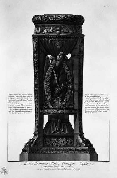 This is Giovanni Battista Piranesi’s print, “Another view of the same,” made with etching and engraving. The formidable monument fills the frame, rising from the lower edge to loom above us. The structure is defined by a hierarchy of forms, each level intricately ornamented, culminating in an elaborate cornucopia. Piranesi uses contrasting textures and tonalities. Linear precision defines fluted columns, while deeper blacks evoke the carved reliefs and shadows, lending the image depth. The monument is framed by winged sphinxes, which disrupts a singular reading. The composition is more than an illustration; it destabilizes the values it seems to represent. Is this a celebration or a critique of grandeur? Piranesi does not offer us a singular, stable meaning. Instead, through the orchestration of form and texture, he provokes us to question the very nature of representation and the narratives that monuments seek to uphold.