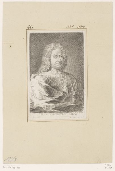 This is Emil Villumsen's "Herreportræt", currently held at the SMK. The monochromatic print measures 170 by 160 millimeters. The portrait is defined by strong contrasts and a formal composition. The man’s elaborate wig is rendered with detailed lines, contrasting with the solid dark background. His attire, from the draped robe to the carefully arranged cravat, suggests status. Villumsen’s use of light and shadow defines form and texture, creating a sense of depth within the limited palette. Consider how this formal approach might reflect broader structural concerns. The subject’s face is subtly lit, inviting the viewer to engage with his gaze. This focus directs our interpretation, encouraging us to consider the cultural codes around portraiture and representation of power. It's a study in the semiotics of appearance. The meaning of "Herreportræt" lies not just in its aesthetic appeal but also in how it engages with philosophical ideas about identity and social structures.