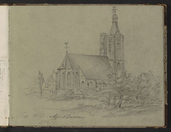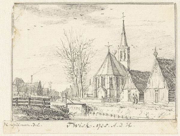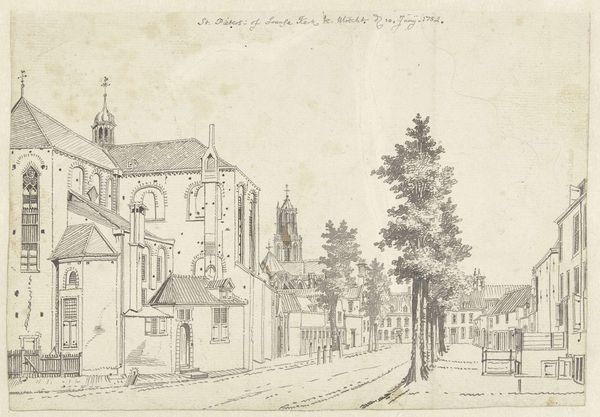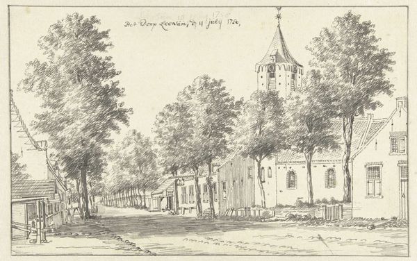 Curator: This pen and pencil drawing, possibly created between 1750 and 1757, is entitled "Gezicht in Amerongen," or "View of Amerongen," attributed to Jan de Beijer. Editor: My first thought? A peaceful Sunday morning. It's quiet, the light is soft, and there's a sense of reverence. I can almost hear the birds chirping and feel the cool air. Curator: Yes, the serenity is striking. De Beijer's approach speaks to a period grappling with ideas of religious authority, civic order, and emerging national identity in the Netherlands. The placement of the church is significant. Editor: Absolutely. It’s not just a church; it’s a silent, steadfast presence, a reminder of something greater. I like how the street seems to lead straight into it, as if life's journey inevitably arrives at that destination. It also seems like a quick study, a memory being captured. Curator: I agree, its documentary style lends the piece some importance. In a society increasingly concerned with accurately mapping its own territory and understanding its history, such a depiction of a specific location holds weight, asserting cultural pride. The attention to detail is striking. Editor: Agreed. Check out how he’s handled the foliage. The textures, all achieved with what looks like the simplest of lines…it’s incredible. It breathes life into the sketch, keeping it from feeling sterile. Curator: Looking through the lens of social history, how do we read the accessibility of the church, both its physical location at the top of those stairs but also the suggestion of it dominating social and religious lives? Is this drawing simply about the aesthetics of the church, or the relationship to power structures? Editor: It is interesting to think about this piece through those lenses, and certainly the institutionalized Church carries complicated social history in Europe. At the same time, on a personal note, my artistic take-away is of the beauty and timelessness of light. I love how simple tools can so powerfully evoke depth, and it reminds me of how much beauty exists right around us, waiting to be sketched, drawn, and felt. Curator: Ultimately, it is how the artist situates himself, both physically and ideologically, relative to the view of Amerongen and how viewers today relate that makes this drawing a culturally revealing piece. Editor: Precisely, I guess this is the everlasting power of art, allowing us all to connect across so many eras and contexts.