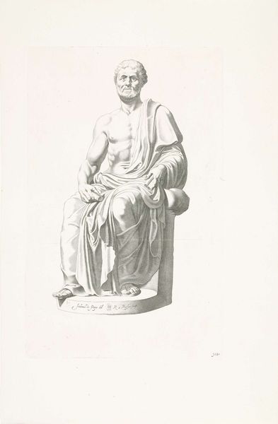 Editor: Here we have John Gibson’s drawing of ‘William Huskisson’ which, interestingly, is actually a drawing *of* a statue. It feels like an exercise in idealization, perhaps, a very composed and formal depiction. What can you tell us about this figure and how the artwork participates in his narrative? Curator: Gibson’s drawing highlights the complexities inherent in Neoclassical portraiture. On one hand, there's this attempt to elevate Huskisson, a prominent politician, by representing him in the timeless language of classical sculpture. The figure almost appears god-like, a symbol of authority and reason, referencing an idealized past to legitimize contemporary power structures. Editor: But is it *just* idealization? What about Huskisson, the man himself? Curator: Exactly. It’s crucial to remember Huskisson’s role in shaping trade policies, particularly in the context of the burgeoning British Empire. The artwork, by cloaking him in this Neoclassical garb, perhaps subtly obscures the potential human cost of those policies, softening the realities of economic expansion. Who was benefiting and who was being marginalized as Huskisson championed these policies? I think that's what is missing from this drawing. Editor: So, by drawing a sculpture that evokes classical ideals, it almost sanitizes a complex political legacy? Curator: Precisely. And the very act of drawing this sculpture also says something. It’s another layer of removal, suggesting a self-conscious engagement with representation itself. We should ask ourselves how it continues a very particular and narrow narrative, not just about power but also about who gets remembered, and how. Editor: That's really changed my perspective. I initially just saw it as a straightforward portrait, but there’s a whole conversation happening about power, representation, and historical narratives embedded within the drawing. Curator: Yes, and by questioning these seemingly straightforward representations, we can start to uncover the more challenging aspects of history that are often left unsaid.